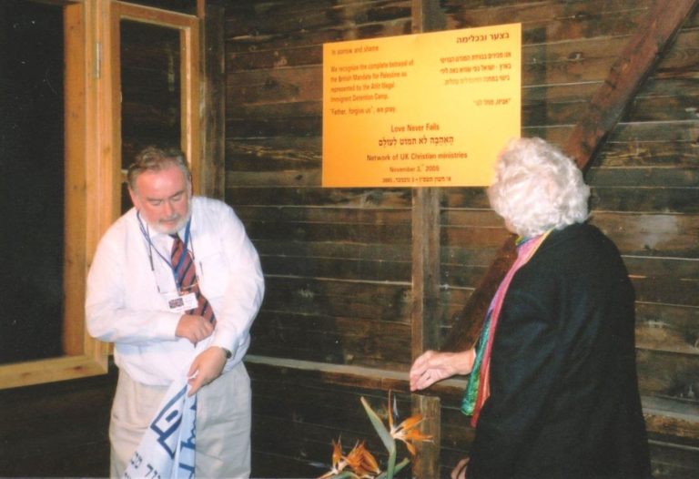 In 2001 the British group that had attended the Repentance Conference in Jerusalem visited the 'Illegal Immigrant' Detention Camp at Atlit, near Haifa in Israel. This was an internment camp built by the British to hold Jewish people trying to reach the shores of Palestine who did not have the necessary permit. Britain severely restricted Jewish immigration in the 1930s and 1940s and there were many Jews trying to flee from Europe and return to their homeland. Many were interned in Atlit, or sent to a similar camp on Mauritius. Of all the places we visited in 2001, Atlit had the greatest impact upon us. Most of us were totally unaware of what the British authorities had done during the Mandate to deter the Jews from coming home.